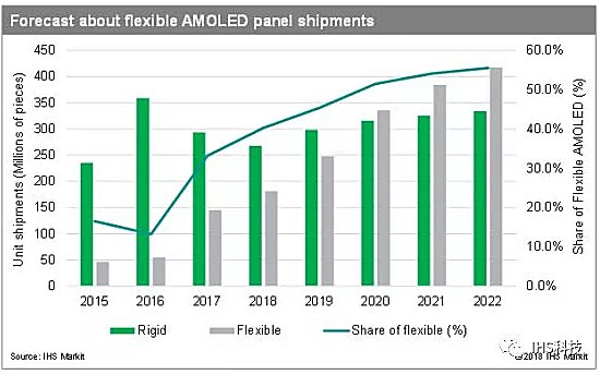 图1:全球柔性AMOLED手机出货量占比统计及预测(数据来源:IHS Markit)