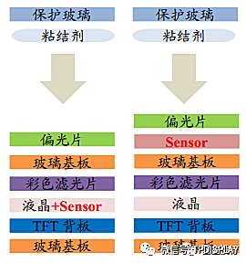 图6:In-cell(左)和On-cell(右)内嵌式触控技术结构示意图