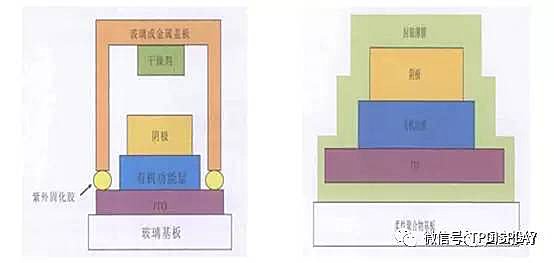 图7:以玻璃为衬底和以玻璃或金属盖板封装的OLED硬屏(左)与以柔性聚合物材料为基板和以单层或多层薄膜材料封装的OLED柔屏(右)结构图