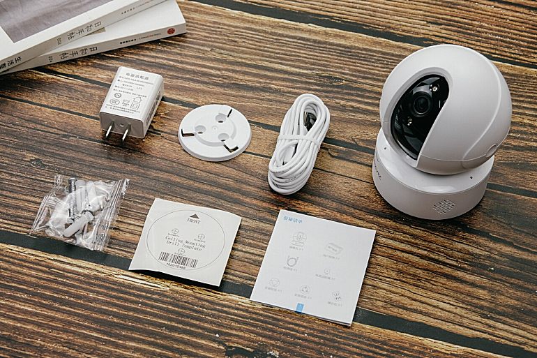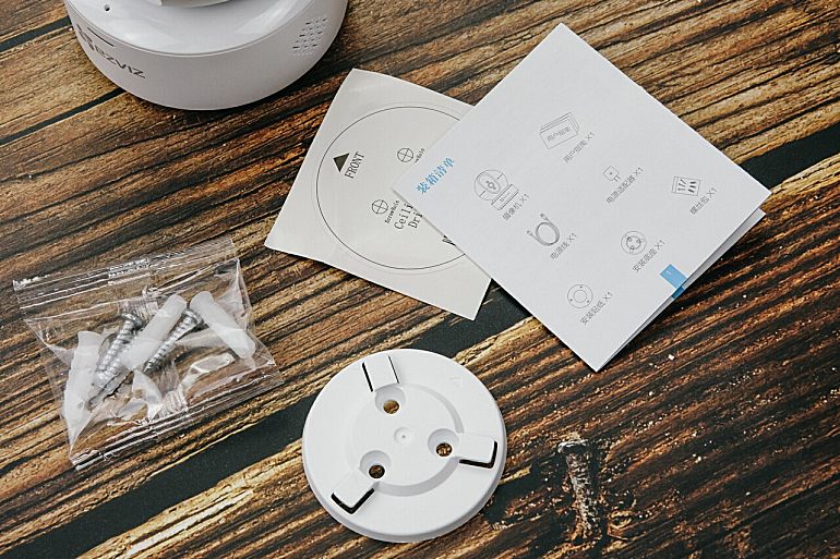 ▲打开包装,取出全套配件:萤石C6C摄像机、电源适配器、电源线、安装底座、安装贴纸、螺丝包、说明书。