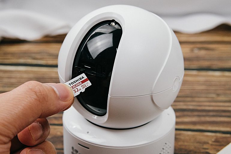 ▲把摄像头部分向上推,可以看见安装TF存储卡槽和Reset按键位置,安装的位置也比较隐蔽,要揭开挡板才能看见。萤石C6C支持三种存储方式:TF存储卡、云存储、硬盘录像机,三种存储方式各有利弊,如果是店铺使用建议就是购买云存储服务,这样能保证数据的安全性,就算摄像机被破坏,存储录像还是保留在云端可以方便调用取证。
