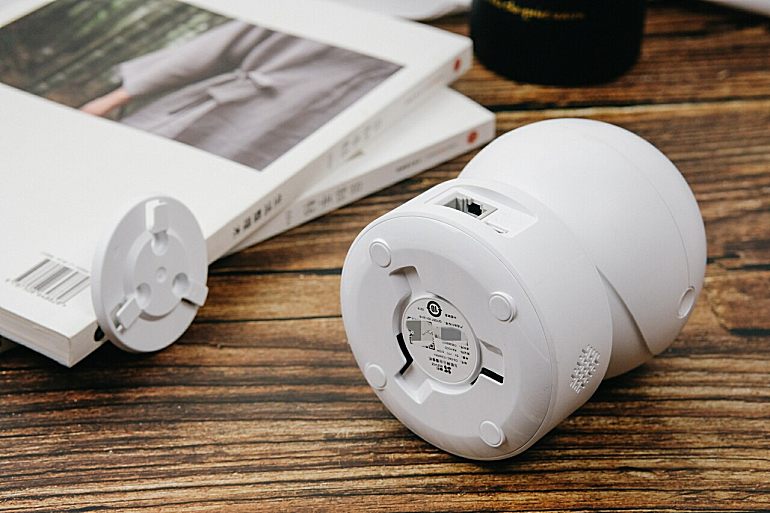 ▲云台背后是网线接口和电源线接口,除了可以WiFi连接外,还支持网线连接,比纯WiFi连接的摄像机多一种选择。如果布置摄像机安装位置靠近路由器的话,建议就是直接使用3网线接入,这样信号传输会更稳定,有时候局域网内调控会受到周围WiFi信号干扰等问题。