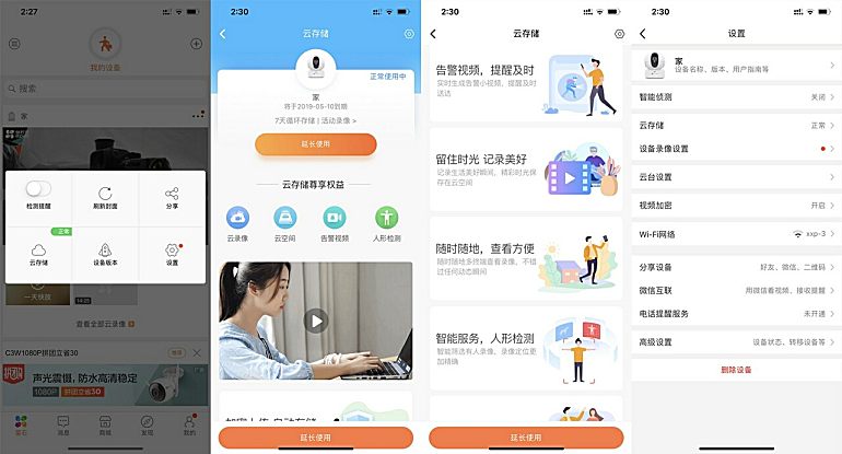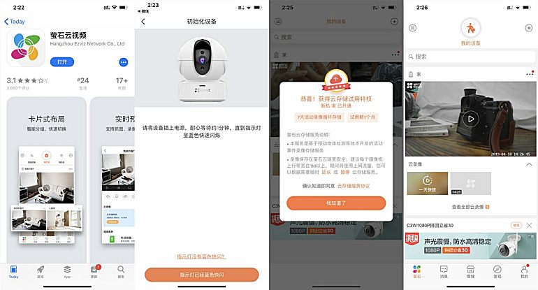 ▲萤石C6C的绑定非常简单,在手机端下载对应的APP,连接WiFi进行绑定即可,对于新用户也是提供了云存储功能的试用体验,对于自己不了解需要本地存储还是云存储的用户来说1个月的体验时间可以在后期能得到比较好的了解。绑定连接成功之后就会进入摄像机管理界面了,界面的功能也是比较简单易懂的。