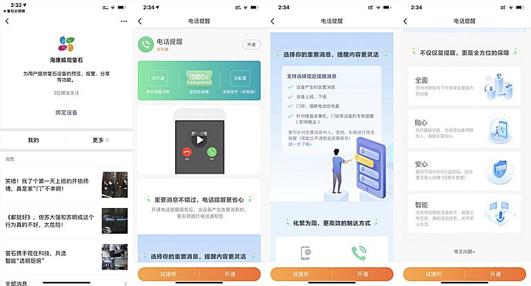 ▲主要是对摄像的一些功能设置调控,例如对摄像机的升级固件,和检测提醒。萤石C6C可以和微信互联,利用公众号关注并绑定设备后,可以在微信接收到摄像机异常提醒的推送信息,也可以设置电话提醒,不过电话提醒功能是需要付费使用的,当然它也带了体验设置,设置后可以收到0571区号打来的电话。