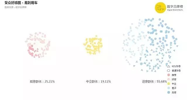 据数字品牌榜发布的数据,11月16日-18日,易到逆意群体占55.68%,远远高于此期间为12.44%的全网反感均值。