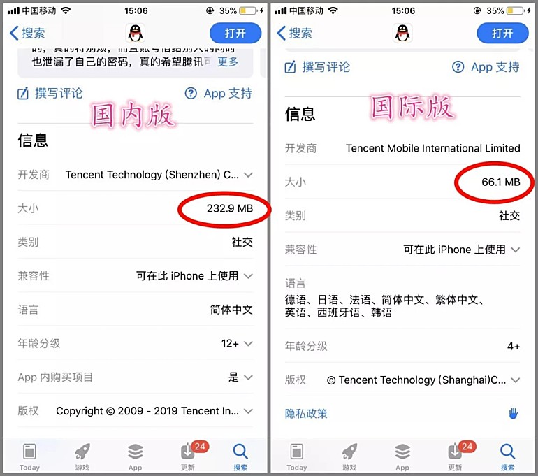 国际版不光页面更简洁,连下载包的大小,都要小得多,才66.1M,国内版有232.9M。