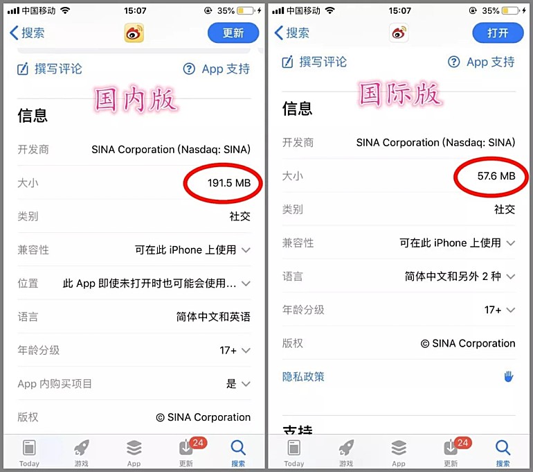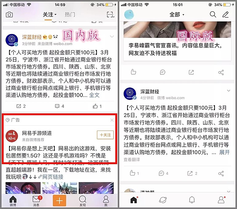 实际上,不光是爱奇艺、微博等这样,凡是大家常用的软件都是分国内版本跟国际版本的,国际版大多都是特别清爽无添加的APP,不会像国内这样臃肿而且好多广告。