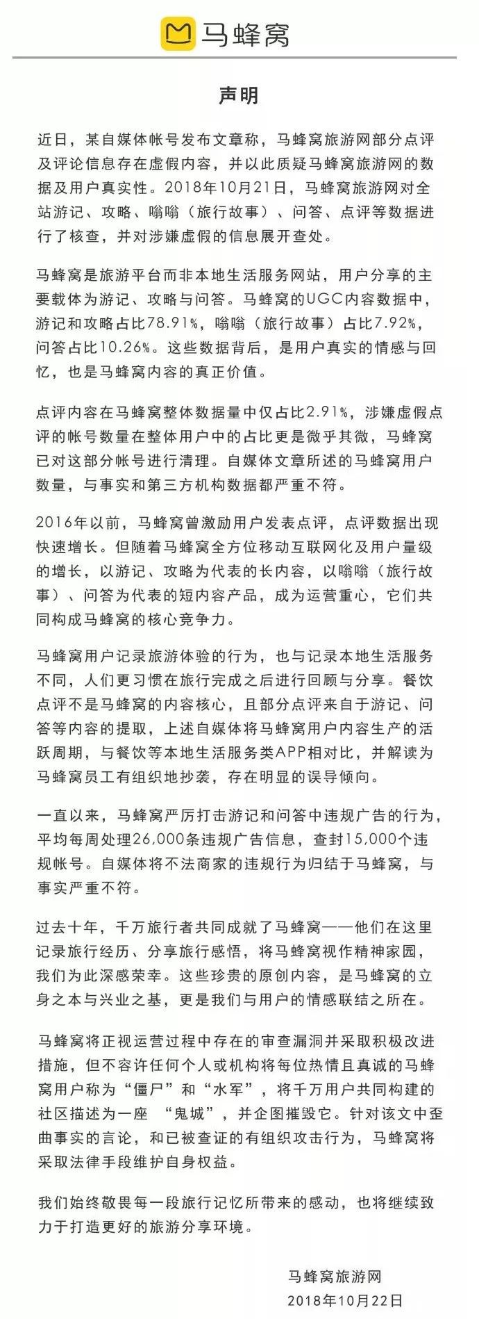 马蜂窝回应数据造假:文章所述事实和数据都严重不符