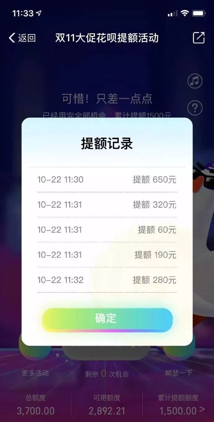 临近双11,为了让大家更加无阻碍的“剁手”,支付宝花呗也开放了提额活动,可领取双11临时额度。想要获取临时额度,你需要玩一个小游戏,在5秒时间内将一直鸭子的头尽量拉长,达到一定长度才能获取额度,每人有10次机会。