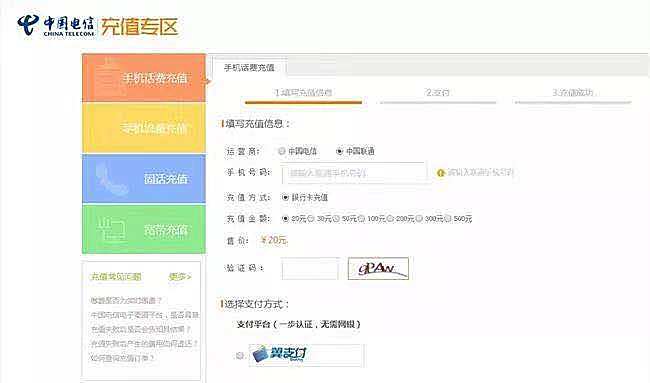 在充值金额方面也做了限制。为中国电信的手机号码充值话费时,用户可以自由填写5-500元之间的整数作为充值金额,但为中国联通的手机号码充值话费时,只可以选择20元、30元、50元、100元、200元、300元、500元这七种充值金额,不能自由填写。