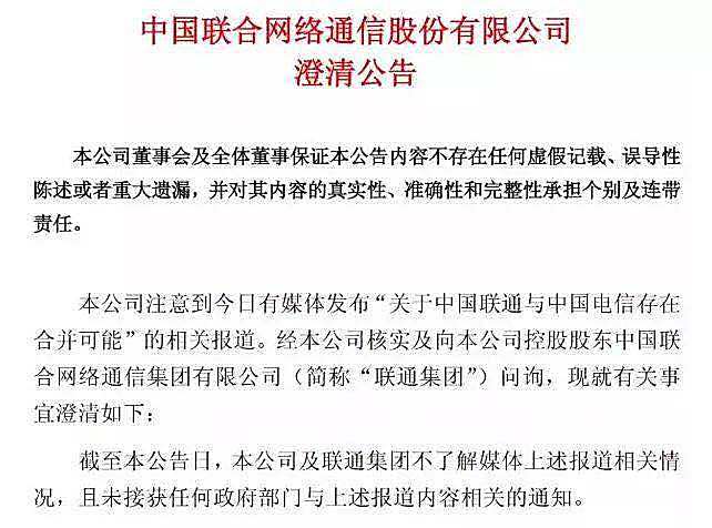 不过去年9月4日,中国联通官方层面还就中国联通与中国电信合并的相关报道,发布了澄清公告称:公司不了解相关情况,且并未接获任何相关通知。