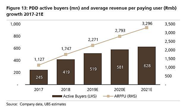 ▲瑞银预测:2021年,拼多多年活跃买家将达6.28亿,用户平均年消费达3296元。按此计算,拼多多2021年的年GMV将达2.07万亿元。