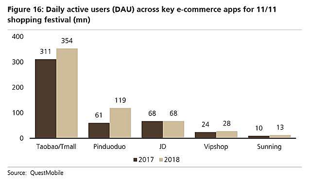 ▲2018年双十一期间,拼多多的日活用户为1.19亿,位列行业第二。瑞银预测,2019年,淘宝和拼多多的日活用户优势将愈发明显