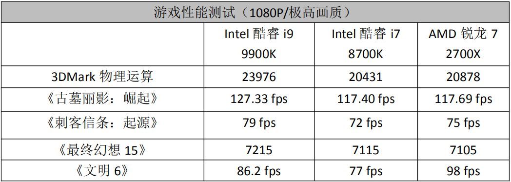 高频率多核心的酷睿i9 9900K光看规格就知道是游戏神器,因此我们也对它的游戏性能充满期待。从实测来看,酷睿i9 9900K的游戏性能领先酷睿i7 8700K大约8%~17%,提升幅度还是可观的,相信搭配更强的显卡差距会更明显。酷睿i9 9900K相对锐龙7 2700X的游戏性能优势并没有之前传闻的那么夸张,但频率方面的压制是确实存在的。