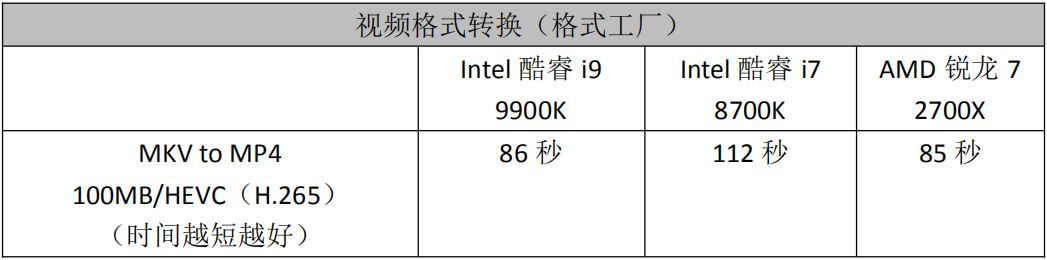 视频转换方面,有可能是软件的支持度还没有达到最佳,导致部分核心在转码时并没有达到最高睿频状态,因此酷睿i9 9900K只是和锐龙7 2700X基本战平,但相对酷睿i7 8700K还是有高达30%的速度优势。