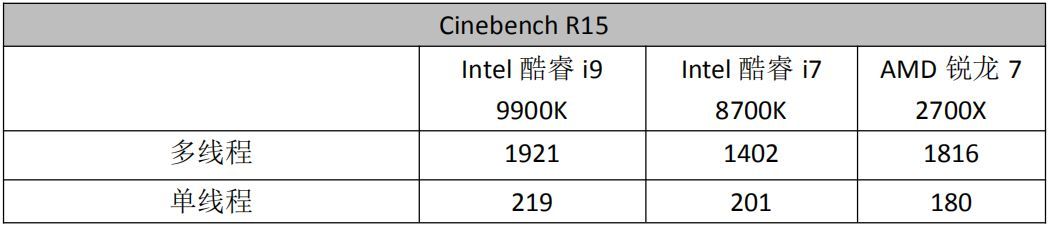 Cinebench R15测试在处理器“核”大战爆发以来变得特别火热,毕竟后期渲染确实最能体现多线程的实用价值。从测试结果来看,酷睿i9 9900K领先酷睿i7 8700K大约37%,相对锐龙7 2700X也有6%的优势。单线程部分一向是Intel的优势,酷睿i9 9900K领先酷睿i7 8700K大约9%,领先锐龙7 2700X大约22%。