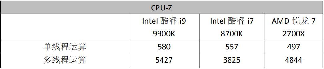 CPU-Z的测试也基本能反映出这几款处理器的综合性能水平差异。从单线程性能来看,酷睿i9 9900K领先酷睿i7 8700K大约4%,领先锐龙7 2700X大约17%。多线程方面,由于不但具备8核心16线程,而且全核心睿频频率也高达4.7GHz,所以酷睿i9 9900K的表现相当抢眼,超越酷睿i7 8700K大约42%,相比同为8核心16线程的锐龙7 2700X也有12%的优势。