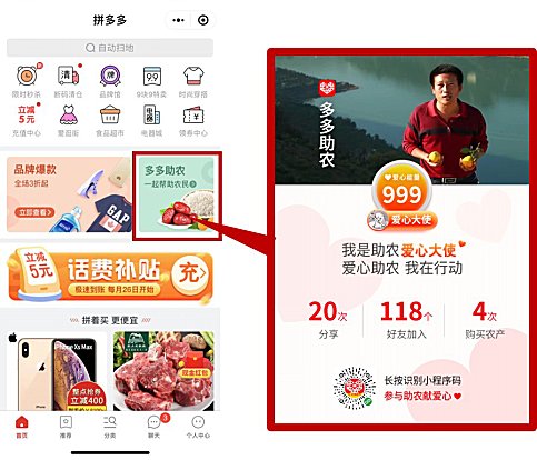 据悉,为开拓更多助农渠道,今年10月初入驻微信钱包的拼多多小程序,用户在双十二期间会分批全量收到微信钱包红点通知。拼多多还于双十二期间在首页推出“多多助农”频道,进一步打通社交与爱心助农渠道。