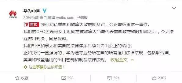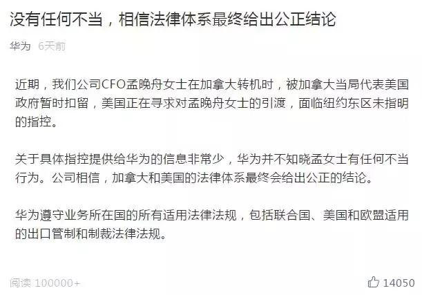 事发之后,华为官方发布声明,称“并不知晓孟晚舟存在任何不当行为,相信加拿大和美国和美国法律体系最终会给出公正的结论”。