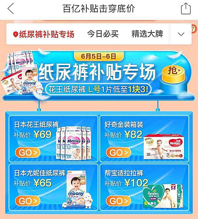 ▲拼多多“百亿补贴”开设纸尿裤等母婴产品专场