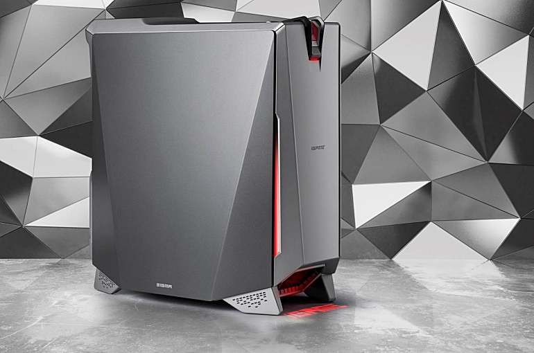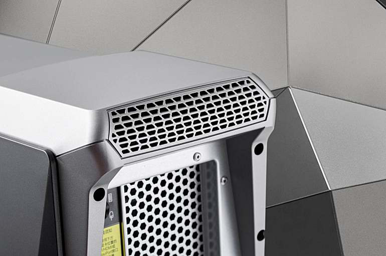 这台主机的机箱外观设计感十足,不像传统台式整机那样古板,也不是面向小众的浮夸,金属灰的色调搭配上浓浓的设计感,让整个主机都变得高冷起来。该主机的外观六个面都进行了全包围设计,从侧面看有一定的角度倾斜,虽然是一款塔式机箱,但整体给人的感觉大小很合适,整体高度463mm,长465mm,底部最宽处223mm,顶部最窄处仅127mm,玩家放在家中也不用特意腾出大量的空间供它安放。