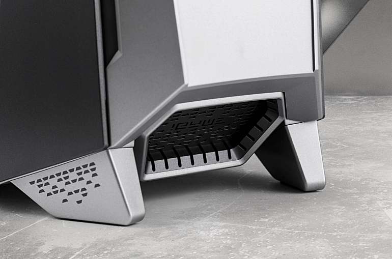 虽然该主机的外观设计给人以高端霸气的感觉,但外观设计元素其实不多,主要集中在机箱的前面板、顶部和底部。该机箱的底部设计有四个独立支撑脚,给机箱以一种灵动的感觉,同时支撑脚的加入让主机和地面隔开了一段距离,在机箱底部也设计有散热孔,这样的设计不但充满设计感,同时更有利于风道设计和整机散热。前部两个支脚中间有一块单独的类似战斗机DSI进气道的区域,采用了栅格化纹理设计,同时还可以投射出红色的iGame信仰灯。