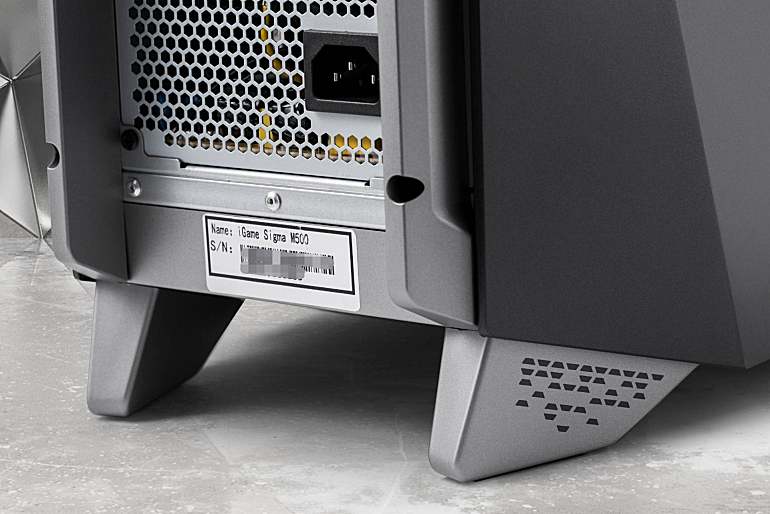 整个主机采用了时下流行的弱化品牌设计,仅在前面板中部和侧板下方有比较小的iGame和Sigma两个LOGO。考虑到玩家不会经常拆装主机,所以iGame Sigma M500的螺丝孔隐藏在机箱的底部,侧面板则采用向下滑开的方式,和市面上传统的向后滑开区分开来,突出设计感。