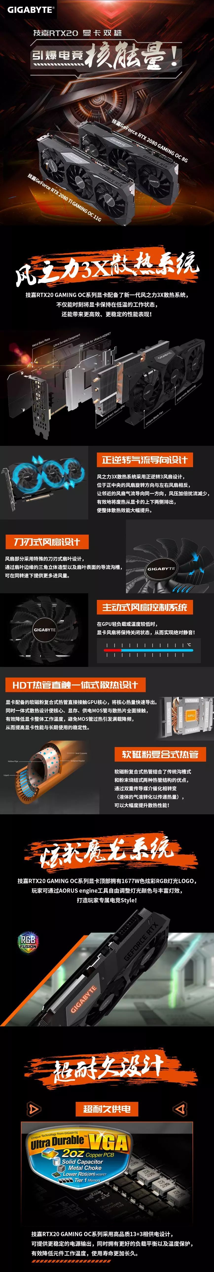 市场中的RTX20显卡产品不少,除了显卡本身之外,大家在显卡散热系统方面的比拼也是无不使出浑身解数。技嘉震撼推出的两款GeForce RTX20 GAMING OC显卡采用的风之力3X散热系统搭载了正逆转设计3风扇设计,配合独家刀刃式扇叶风扇、6根新型软磁粉复合式热管、HDT热管直触技术及半被动式智能散热系统,可大幅提升散热性能,因此这两款显卡性能都要远高于NVIDIA公版产品。当然,它们还有更多黑科技,一起来看长图吧!