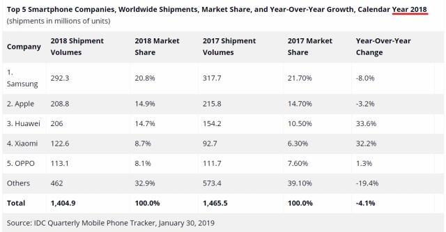 2018年全球智能手机共计出货14.049亿台,年同比下滑4.1%