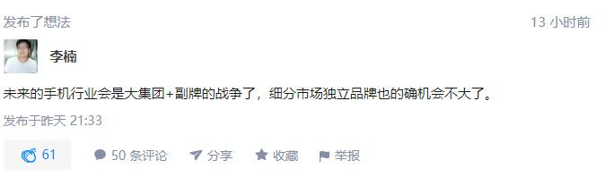 至此,中国智能手机四大头部品牌——华为、vivo、OPPO、小米全部参与了子品牌运营。李楠关于未来手机行业“大集团+副牌”的预测,被证实了!
