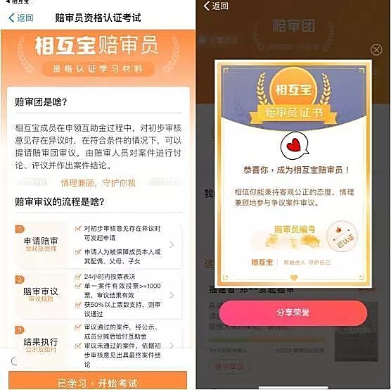 赔审团是支付宝在保险、互助服务上推出的一项创新的争议解决机制。当机构的核查意见不能得到用户认可时,用户可以发起赔审,由全体赔审员兼顾情理做出最终决定。在相互宝上,通过考试的赔审员已经有90万人。