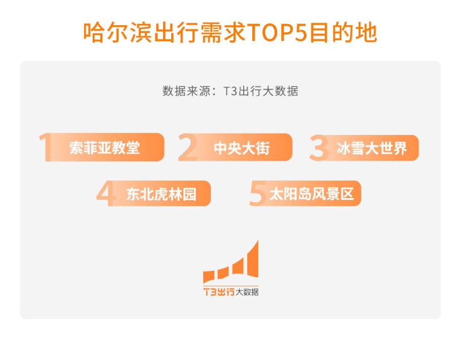 外地游客在哈尔滨游玩,不仅是打卡网红目的地,还钟情体验当地人生活方式。T3出行大数据显示,索菲亚教堂、中央大街、冰雪大世界、东北虎林园、太阳岛风景区是订单量最高的五大目的地,松花江冰雪嘉年华景区、音乐长廊、果戈里大街、巴洛克风情街、伏尔加庄园位列增速最快的五大目的地。