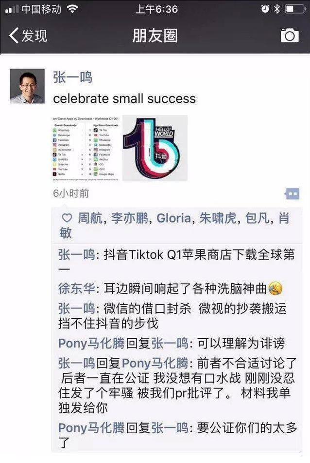 但是,量变并没能带来质变,重点推广的微视也没能翻身,即使是在微信中大力推广微视并且封杀抖音,即使是砸现金,甚至有爆料说从抖音内部挖员工,也导致双方大佬在朋友圈开始口水战,微视仍然像一条咸鱼,没能掀起什么浪花。
