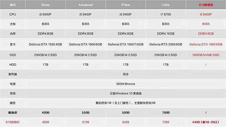iGame Sigma M500分为五个不同版本,首批发售的产品主打甜点级配置,处理器为Intel酷睿i5-9400F,旗舰级的版本则为Intel酷睿i7-8700,搭配七彩虹B365主板。内存方面则配备了8GB DDR4内存(旗舰版为16GB DDR4内存),显卡可选GTX 1650、GTX 1660、GTX 1660 Ti、RTX 2060,硬盘则采用256GB M.2 SSD+1TB HDD的配置。考虑到iGame Sigma M500上市时间正值618大促期间,所以iGame还准备了一款618限量版(限18-20日),采用Intel酷睿i5-9400F+GTX 1660,并配备500GB NVMeSSD,主打性价比。所有配置均预装正版Windows 10家庭版系统,提供一年整机质保(含上门服务)、三年主要配件质保。具体的配置价格见下表:
