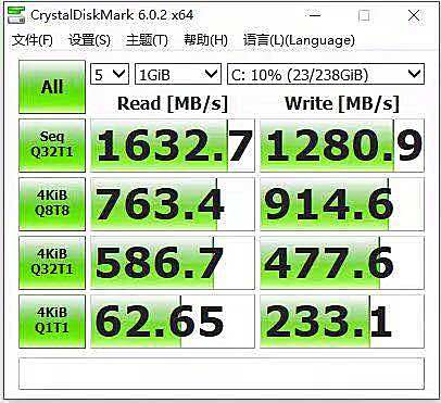 在CrytstalDiskMark的磁盘测试中,该M.2 SSD的读写能力达到了中端主流水平,日常系统和软件启动较快。而配备了1T机械硬盘的组合后,存储能力也得到了很好的解决。
