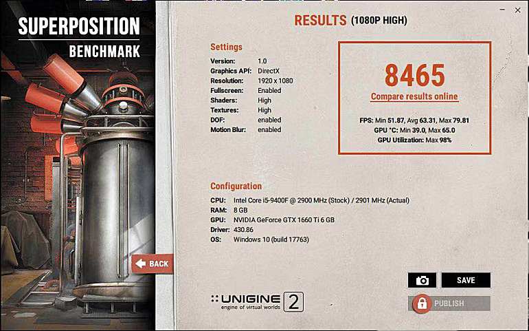 在采用UNIGINE2引擎的SUPERPOSITION BENCHMARK测试中,该主机的1080P中画质得分11470,1080P高画质得分8465,1080P极高画质得分3316。
