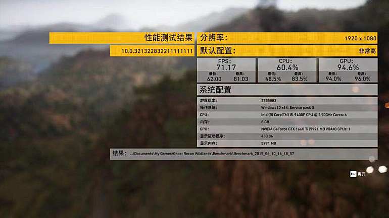 在《幽灵行动:荒野》1080P分辨率极高画质的BenchMark中,该主机的帧速为46.9FPS,而在非常高画质(比最高画质降一档)下则为71.17FPS,最低帧速为62FPS,玩家可以选择在高画质模式下进行游戏,实现画质和帧速的平衡。