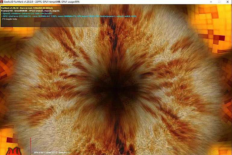在室温28℃的办公室环境中,使用FurMark对显卡进行了20分钟的考机,显卡温度稳定在64℃左右,表现比较不错。此时显卡的boost加速频率为1860MHz。在同样的温度条件下,我们也使用AIDA64对CPU进行了稳定性测试的考机,CPU温度保持在65℃左右。