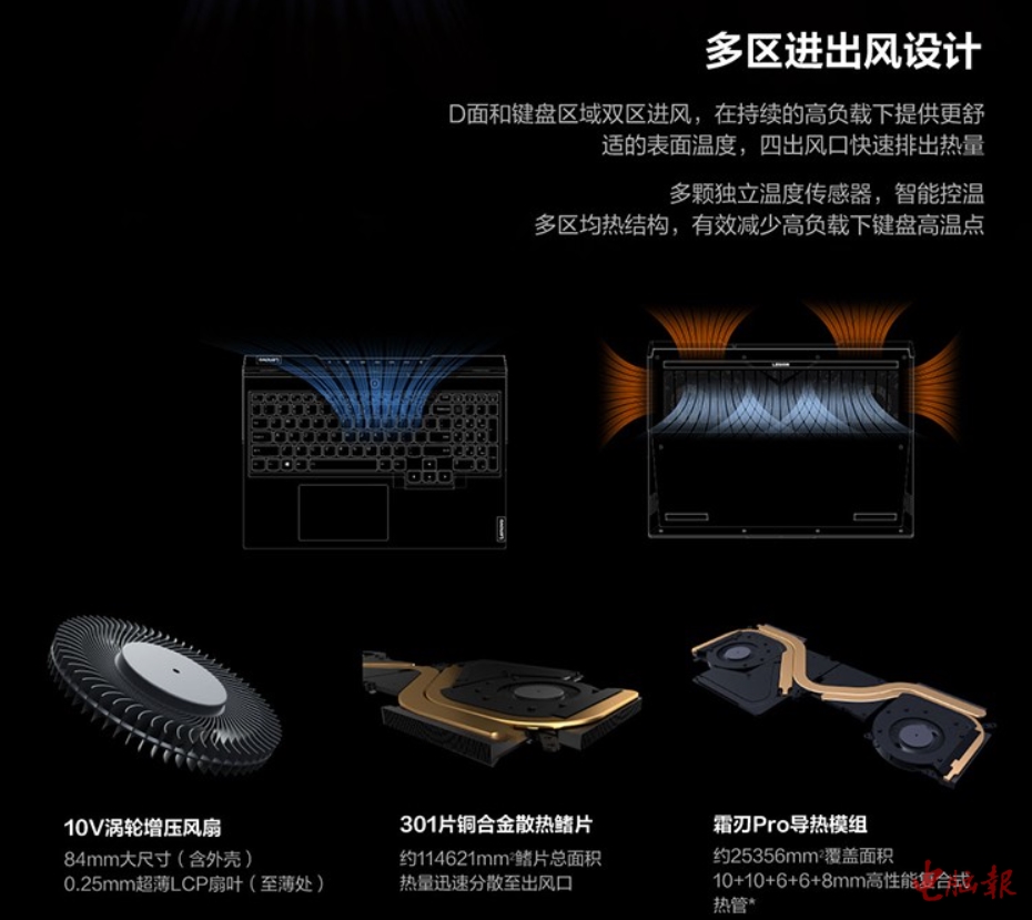 作为一款主打轻薄的电竞游戏本,散热能力也是极为重要的,拯救者R9000X 2021R搭载了霜刃Pro散热系统3.0,双风扇四出风的风道设计,配上全铜的散热鳍片,玩家可以通过Fn+Q的快捷键秒速切换散热模式,适配不同的运行场景。即使是轻薄游戏本也可以拥有高效散热系统。