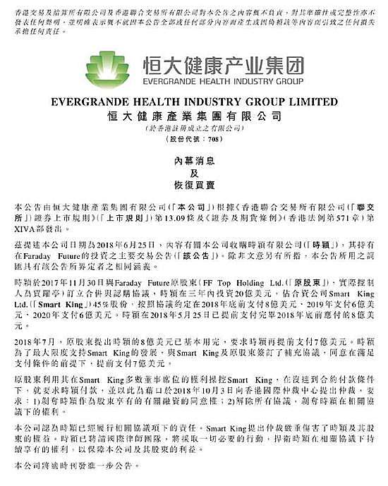 今年6月25日,恒大健康以67.47亿港元的价格收购香港时颖公司100%股份,后者与Faraday Future原股东合资设立了一家名为Smart King Ltd的新公司,恒大健康从此成为Smart King Ltd的大股东。
