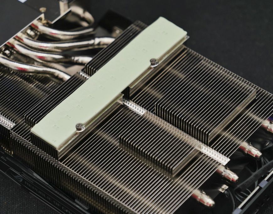 显卡的底座采用了MaxContact镜面直触技术,经强化镜面精密加工,让底座表面更平滑,从而增加与GPU的接触面积,强化导热性能。同时产品采用了2.7插槽设计,让整个散热阵列的表面积增加了20%以上,保证热量能迅速被风扇吹入的气流带走。此外,显卡还搭载了第2代华硕 FanConnect技术,提供2个4pin接口用于连接风扇,此时风扇会根据GPU和CPU的实时温度调节风扇转速,实现对整个主机散热的优化。