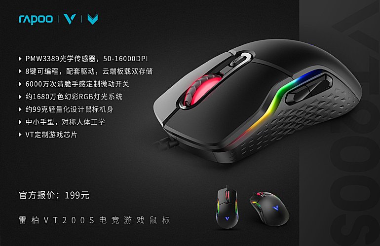 雷柏VT200S已正式上市,拥有纯正的VT血统,PMW3389电竞级游戏传感器,轻量化的设计思路,强悍的硬件配备,贴心实用的功能,个性化的背光系统,再加上199元的官方报价,竞争力非常不错!