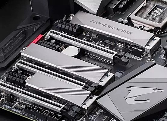 在显卡和内存插槽部分,Z390 AORUS MASTER都加装了合金装甲,不但看起来十分霸气,更能有效保护插槽和屏蔽干扰。Z390 AORUS MASTER板载了3个M.2插槽,全部加装了AORUS风格散热装甲,而且采用了一边卡扣一边螺丝的安装方式,不需要手动对孔位,安装起来非常方便。