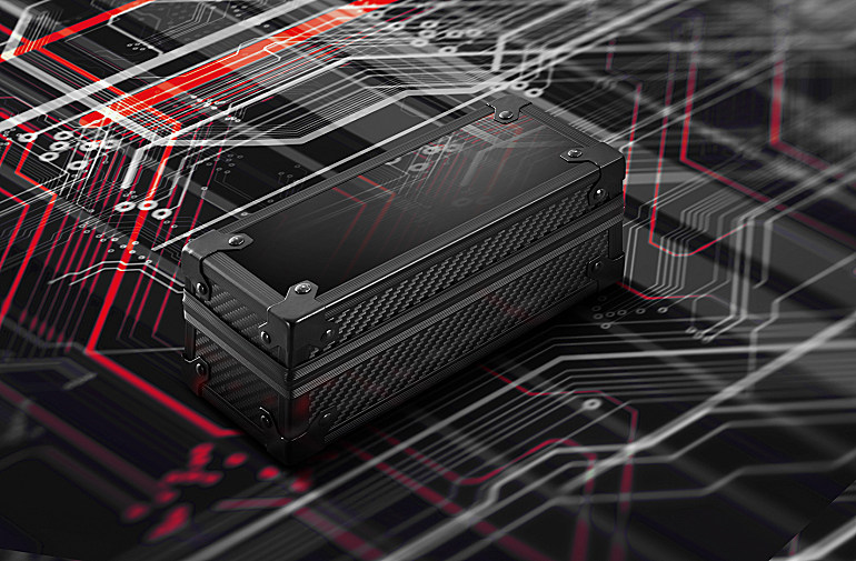侧面有透明的展示窗口,其上印有WE队员的合影。内包装的造型就好像是一个小型的“军火箱”,外围采用了熏黑处理的铝合金框架,表面采用碳纤维纹理,显得非常精致,拿来收藏比较不错。配重模块也装在独立的小工具箱里,方便收纳。总的来说,作为典藏版其包装做得非常不错,可以说是远超同价位的水准。