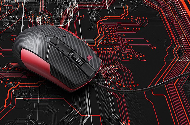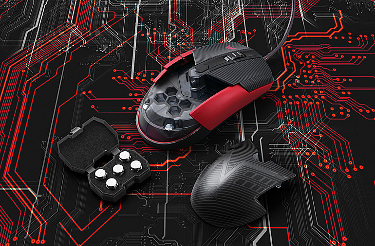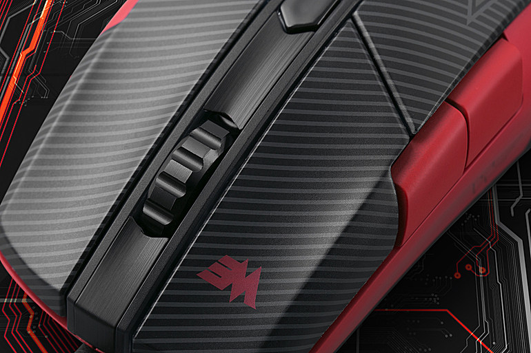 侧裙采用了内敛弧度设计,握持感舒适。滚轮部分采用了CNC工艺阳极氧化的铝合金材质,拥有棱角分明的大凹槽可以起到防滑的效果,滚轮的高度相对来说比较低,能减少游戏中的误触。