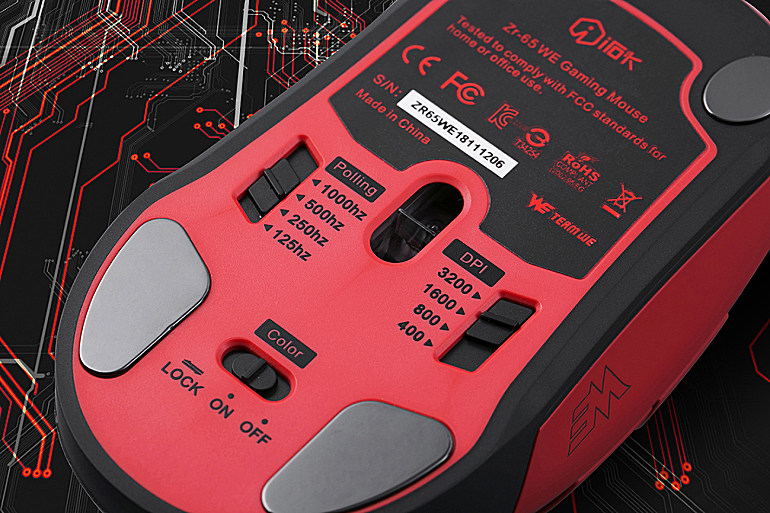 底部的灯光调节按键可以开启和关闭RGB背光,选到LOCK挡则可以锁定当前的颜色。对于专注电竞的玩家来说,鼠标的配置不会经常变动,锆Zr-65将DPI调节等按键放在鼠标底部的设计比目前常用的放在滚轮附近更加稳妥,可以有效避免游戏中激烈操作带来的误触,提升游戏体验。
