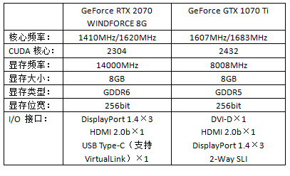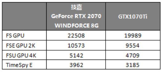 在3DMark各项测试中,RTX2070都明显领先于GTX1070Ti,在DX12的TimeSpy测试中,优势尤其明显。虽然RTX2070的频率、流处理器数量都低于GTX1070Ti,但和RTX2080相同的高显存带宽、更先进的架构让它最终的表现还是大大好于GTX1070Ti。