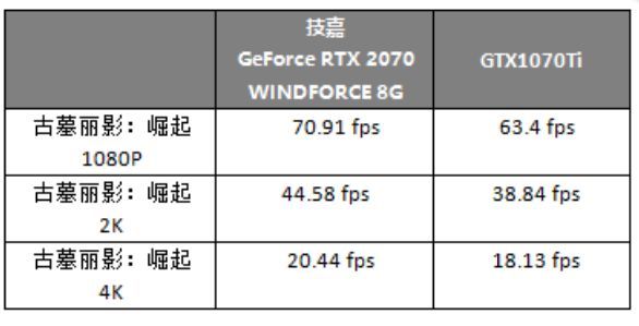 在《古墓丽影:崛起》中,RTX2070的优势比较稳定,在高中低3种分辨率下变化不算特别大。在2K分辨率/极限画质下基本上就达到性能极限了,4K还是有些吃不消,这也符合它的轻旗舰定位。