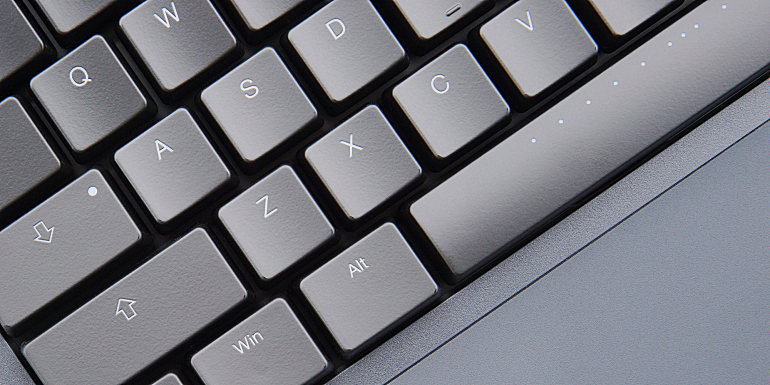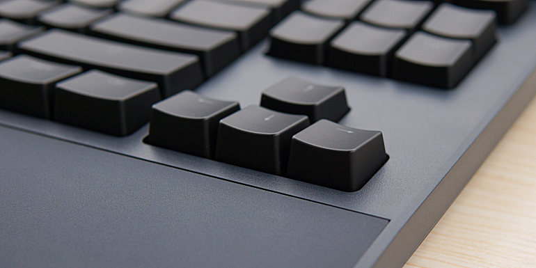▲E401的外观还是非常正经的,简约范儿,稳重内敛,能够很好的融入商务与办公的环境,没有电竞键盘那样强烈的进攻感。一眼看上去,E401的键帽面积是要比普通键盘更大的,据官网数据表示,Table E401的键帽投影面积增大超过40%,好处就是更贴合手指,让按压过程更省力,对于手比较大的小伙伴来说会更加实用,即使不与其它键盘作对比,也很明显从按键之间的间隙能够看出区别。
