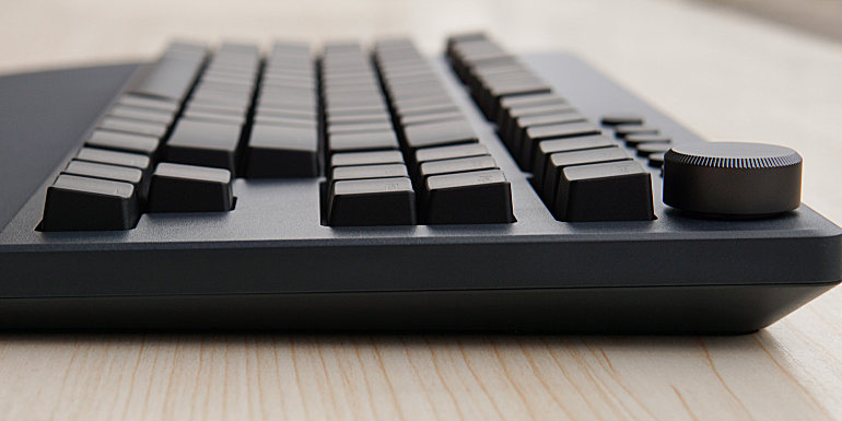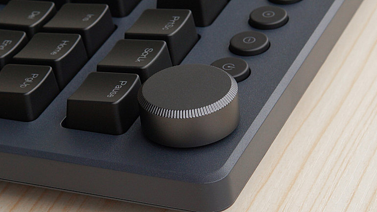 ▲整个键盘最明显的部位,右上角的音量旋钮,多了这个玩意儿档次立马就不一样了,旋钮无极调节,可以360度无限转,试了一下顺时针旋转180之后,Win10上刚好显示增加了30%的音量。阻尼感很小,支持按压,按压后直接静音,再按一下恢复原音量,按压手感稍微偏硬,另外打量了好久,最终才确定这个旋钮是金属材质的。